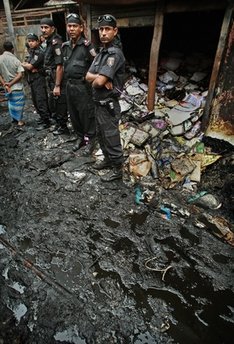 6月4日,孟加拉國安全官員維護火災現場秩序