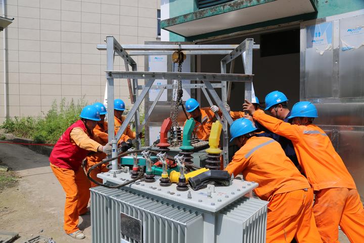 現(xiàn)場(chǎng),施工人員8個(gè)人一組,把老舊的電纜拆除,將新的線(xiàn)徑更粗的電纜穿過(guò)地下孔洞,繞到配電室一側(cè),再重新搭接線(xiàn)路。停電、驗(yàn)電、吊離變壓器,安裝新變壓器……供電員工沒(méi)有片刻停頓,每個(gè)步驟有條不紊,迅速完成增容任務(wù)。